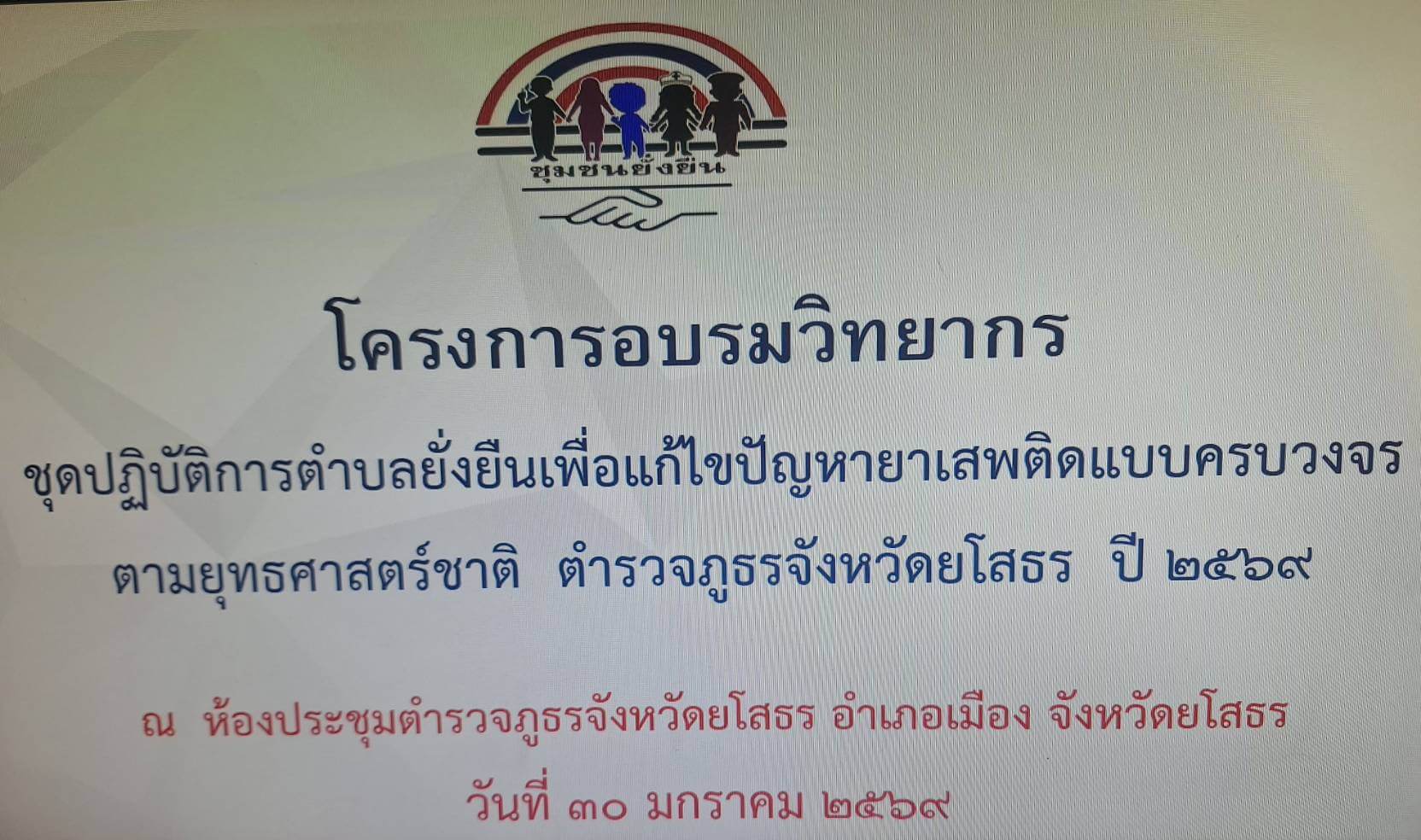 วันที่ 30 ม.ค.69 เวลา 08.30 น. พ.ต.อ.อดิเทพ พิชาดุลย์ รอง ผบก.ภ.จว.ยโสธร พร้อม หน.ชุดปฏิบัติการตำบลยั่งยืน 11 สภ.ในสังกัด , ฝ่ายปกครอง, สาธารณะสุข , ผู้นำชุมชน และเจ้าหน้าที่ที่เกี่ยวข้อง ร่วมโครงการอบรมวิทยากรชุดปฏิบัติการตำบลยั่งยืนเพื่อแก้ไขปัญหายาเสพติดแบบครบวงจร ตามยุทธศาสตร์ชาติ ภ.จว.ยโสธร ปี 2569